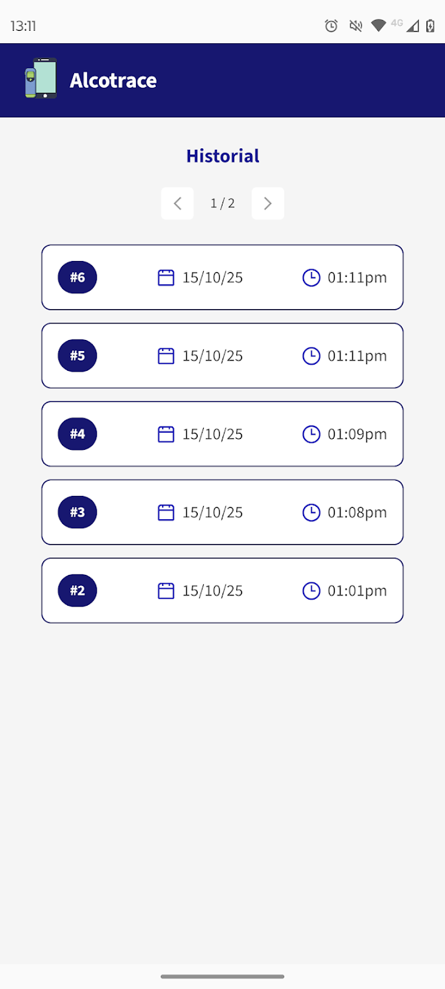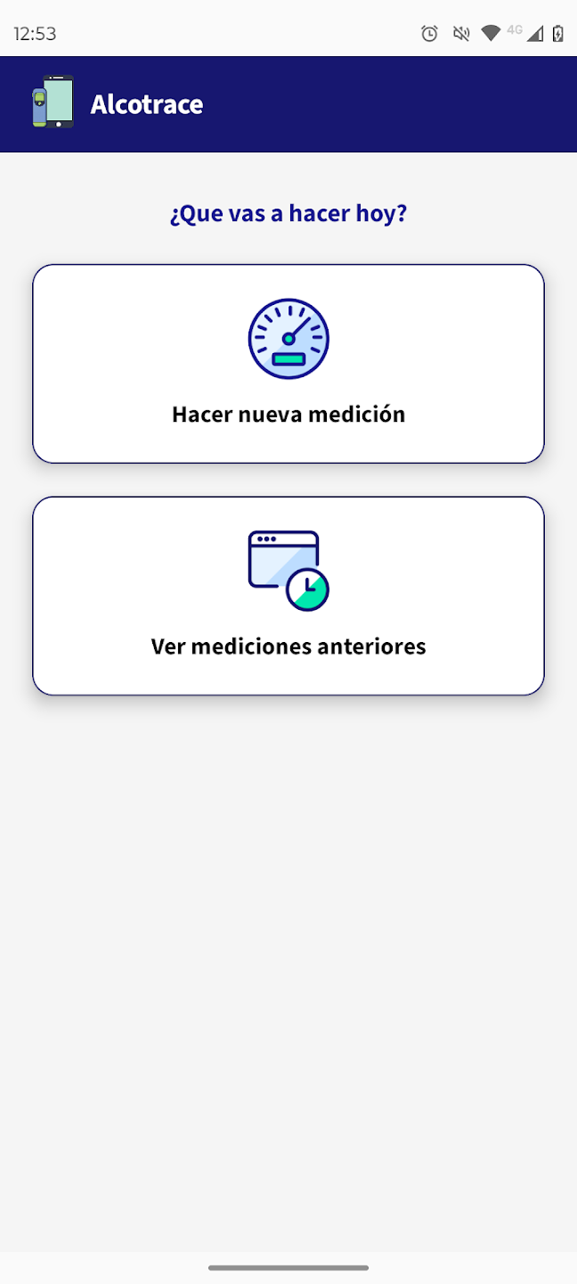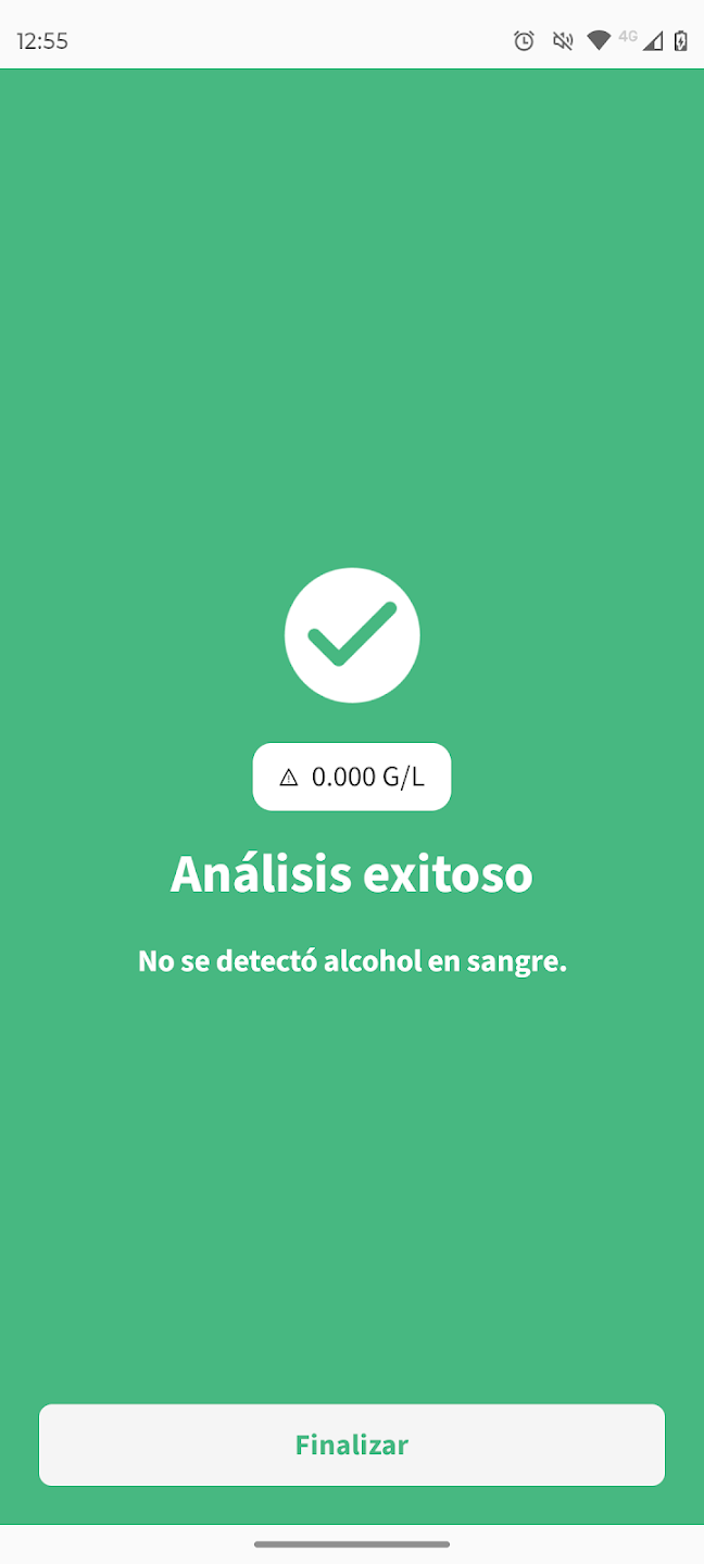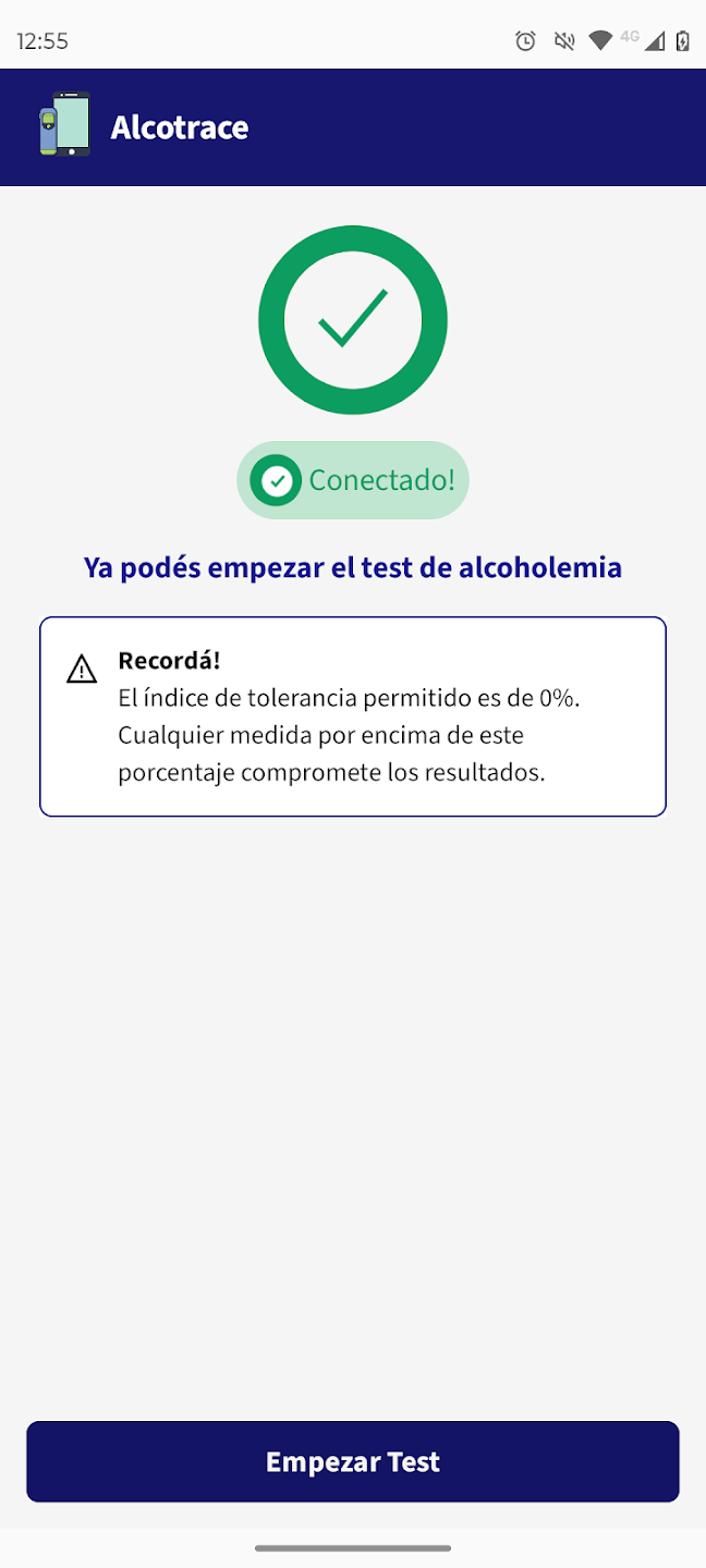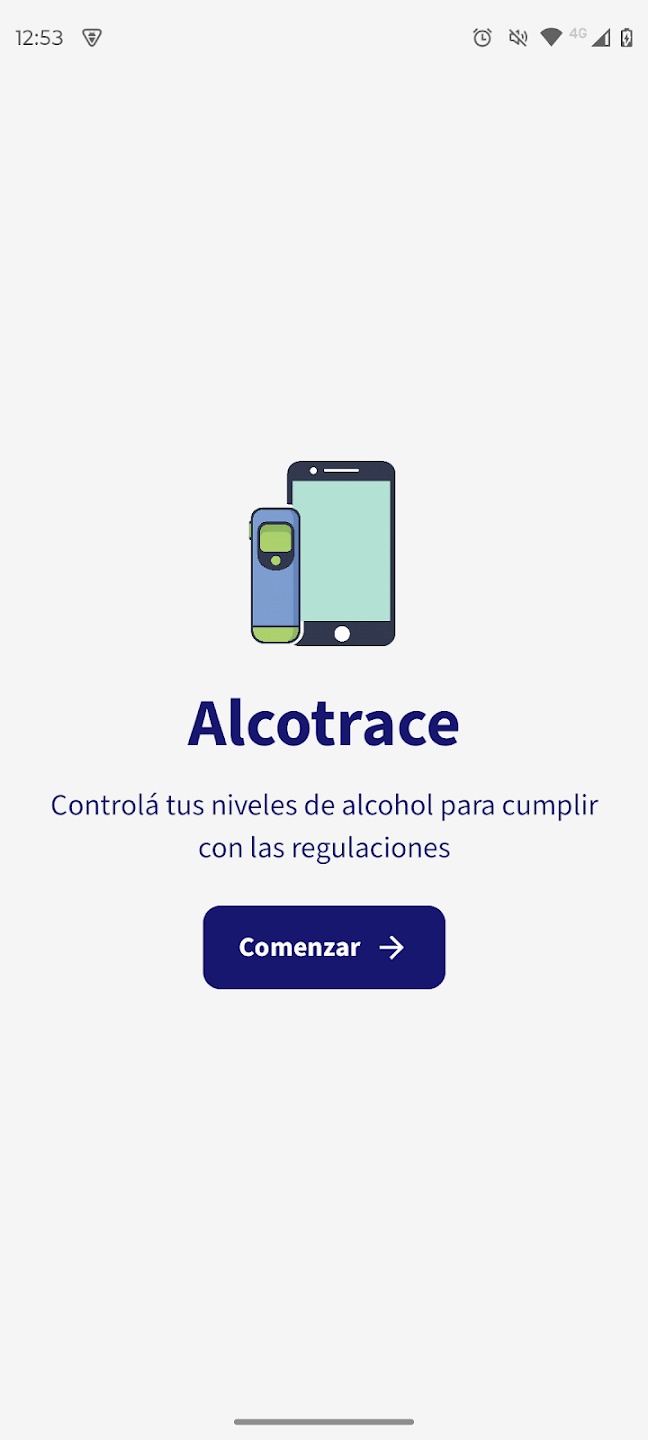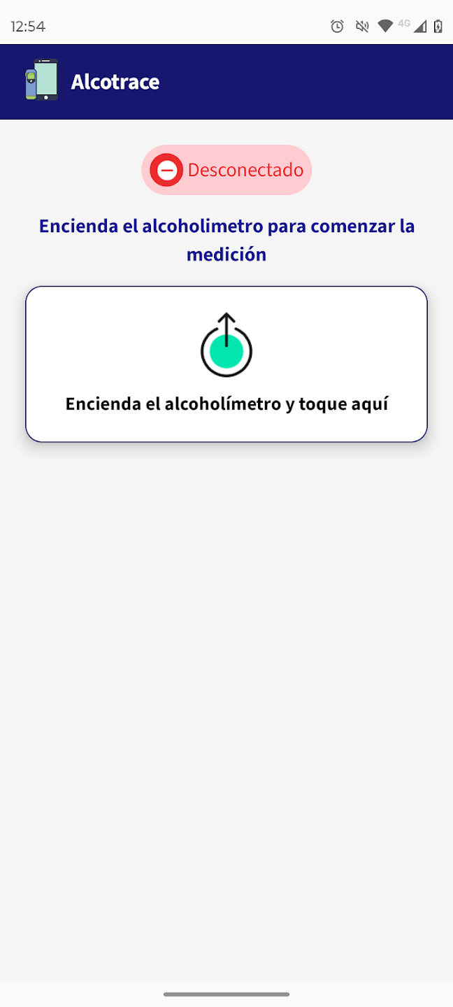 Esta app se integra con un alcoholímetro externo mediante bluetooth. Gestiona todo el proceso de medición y presentación del resultado, y su registro en el servidor central cuando se trata de una medición oficial. Para autenticar al usuario que está solicitando o realizando la medición se utiliza reconocimiento facial a través de Face ID. Por último, permite consultar el historial de mediciones realizadas por el usuario.